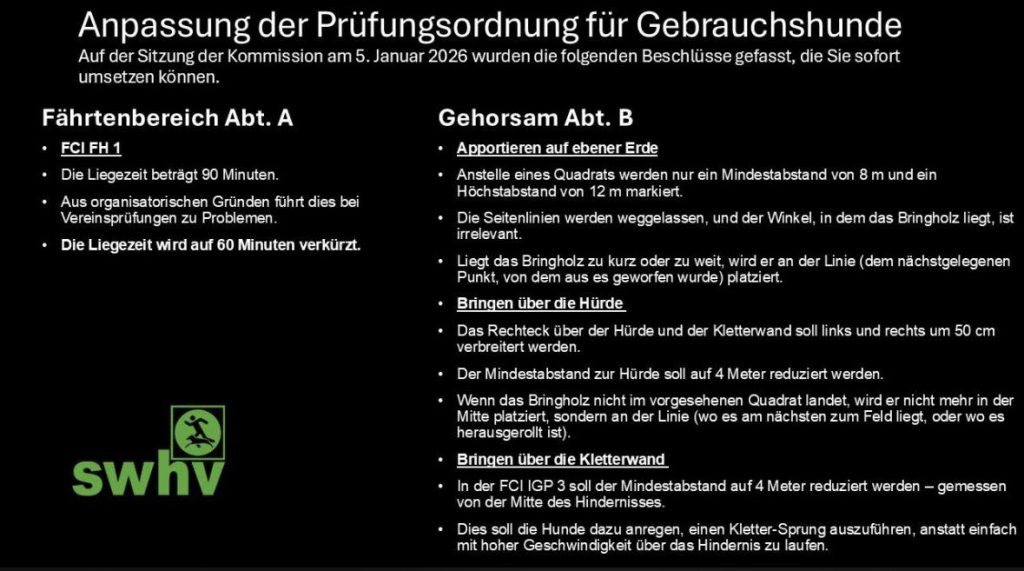 - Am 5.1.26 wurde von der FCI-Gebrauchshundekommission eine Anpassung der aktuellen Prüfungsordnung für Gebrauchshunde vorgenommen.